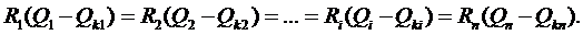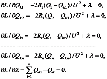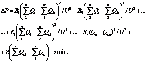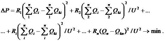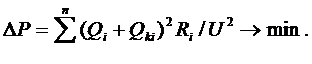 Требуется найти оптимальное распределение между потребителями 1, 2,…п заданной суммарной мощности «компенсирующих устройств Qk. Критерий оптимальности - минимум потерь активной мощности в схеме.
