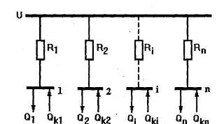 Рассмотрим такую задачу для радиальной схемы электроснабжения (рис. 2.8). Источник питания имеет напряжение U. От этого источника питаются п потребителей с реактивными мощностями Q1, Q2…Qn. Активные сопротивления линий между источником и потребителями составляют R1, R2, … Rn. У каждого i-ro потребителя может устанавливаться компенсирующее устройство мощностью Qki.