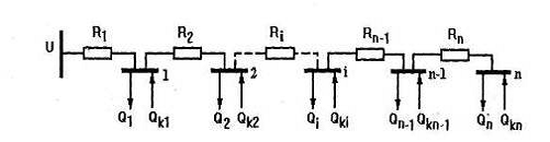 Рассмотрим задачу оптимального распределения заданной мощности компенсирующих устройств Qk между потребителями 1, 2,...п в магистральной схеме электроснабжения (рис. 2.9).