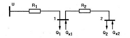 Пример. В существующей схеме электроснабжения (рис. 2.10) требуется определить мощности компенсирующих устройств QKl и Qk2 в узлах 1 и 2 исходя из условия минимума суммарных затрат на установку этих устройств и покрытие потерь активной мощности в схеме.