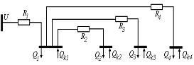 реактивные нагрузки узлов 1 и 2 Qi=600 квар и Q2=800 квар;