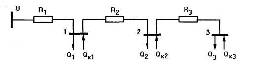Пример. Составить математическую модель для определения в схеме электроснабжения (рис. 3.1) оптимального узла установки компенсирующего устройства, заданной мощности Qk. Критерий оптимальности - минимум потерь активной мощности в схеме.