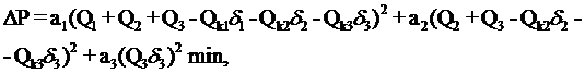 Выражение для потерь мощности предусматривает возможность установки компенсирующего устройства в каждом из трех узлов. Однако в зависимости от величины двоичной переменной компенсирующее устройство в узле i должно быть установлено при di =1 или не должно быть установлено при di =0.
