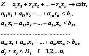 В детерминированной постановке оптимизационной задачи коэффициенты zi, аji и bj (i=1,2,... n; j=1,2,... m) и границы di и Di диапазона изменения переменных однозначно определены.