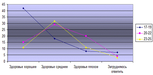 По состоянию хорошего здоровья наиболее выделяется в положительную сторону возрастная группа с 17 до 19 лет и в негативную - возрастная группа от 23-25 лет. Это можно объяснить тем, что молодежь в возрасте от 17-19 лет еще очень активна и придерживается все же здорового образа жизни, отсутствует усталость.