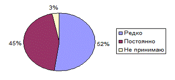о том, что 52% опрошенных принимают их редко; 45% - постоянно и всего лишь 3% -