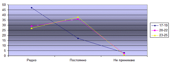Студенты в возрасте от 17 до 19 лет принимают лекарственные средства в основном редко, 2% из названной возрастной группы не принимают лекарств и только 9% - пользуются ими постоянно. Это очень хороший показатель. Именно в этой возрастной группе находится то число с иммунной системой, которая не нарушена или придерживается здорового образа жизни.