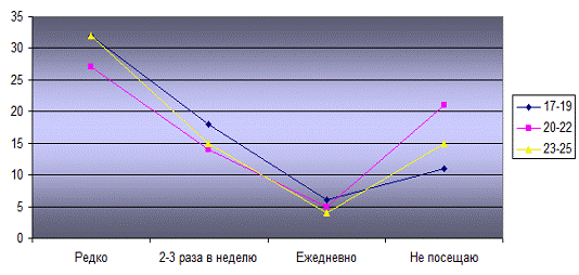 На рисунке (Рисунок) представлен график, на котором показан уровень влиятельности компании, ведущий «разгульный образ жизни» по каждой возрастной группе и сделаны следующие выводы: самыми влиятельными на такую компанию являются молодые люди в возрасте от 17-19 лет. Это можно объяснить тем, что данная возрастная группа еще полноценно не сформировалась как личность и тем самым влияние на определенного студента от 17-19 лет имеет место быть.