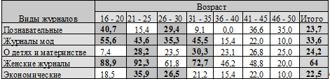 Таблица 1. Зависимость видов и возраста читателей журналов ( в %).