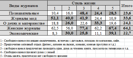 Таблица 2. Зависимость стиля жизни читателей и видов журналов (в %).