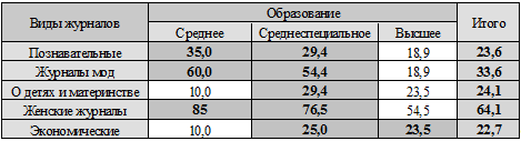 Таблица 3. Зависимость образования респондентов и видов журналов (в %).