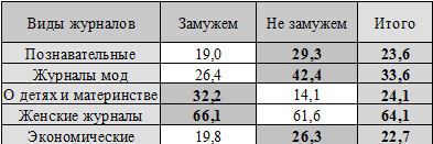 Таблица 4. Зависимость семейного положения респондентов и видов журналов (в %).