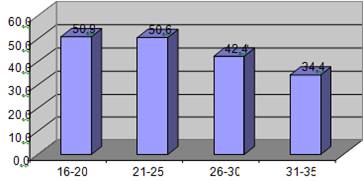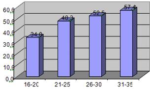 Женщины в возрасте от 21 до 25 лет в большинстве