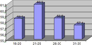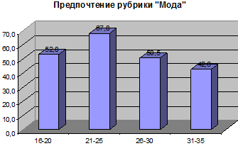 Опрошенные девушки в возрасте от 26 до 30 лет предпочитают (в порядке убывания) Cosmopolitan, Glamour, Домашний очаг. Менее популярные Лиза, отдохни, Vogue., Лиза, Караван историй, Отдохни - самые читаемы журналы в группе 31-35 лет. Менее популярен журнал 7 дней.