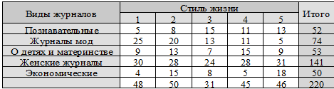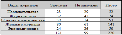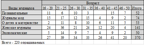 Таблица 1. Зависимость видов и возраста читателей журналов.