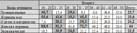 Таблица 1. 1. Зависимость видов и возраста читателей журналов ( в %).