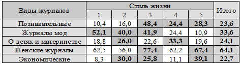 Таблица 2. 1. Зависимость стиля жизни читателей и видов журналов (в %).