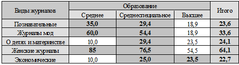 Таблица 3. 1. Зависимость образования респондентов и видов журналов (в %).