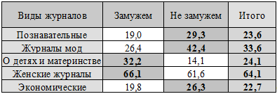 Таблица 4. 1. Зависимость семейного положения респондентов и видов журналов (в %).