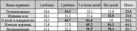 Таблица 5. 1. Зависимость количества детей у читателей и видов журналов (в %).