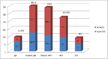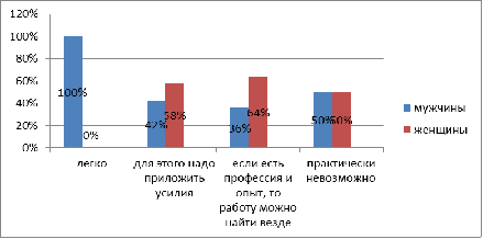 Почти половина опрошенных убеждены - чтобы найти подходящую работу, требуется приложить для этого немало усилий. 29% считают что в нашем городе мало шансов найти походящую работу, при чем так отвечали и женщины и мужчины в равной степени. Многие (23,5%) связывают достойное рабочее место с опытом работы по своей профессии. И только четверо мужчин утверждают, что работу в Тамбове найти очень даже просто (см. рисунок 13). Таким образом, мы видим, что мужчинам найти в нашем городе работу, хоть немного, но легче, чем женщинам. Это связано с тем, что в основном в нашем городе требуются специалисты среднего звена, обладающие физической силой и техническими навыками, то есть представители «сильного» пола.