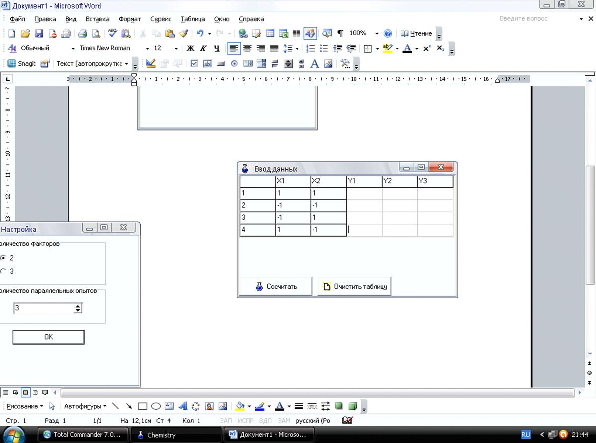 Расчет матрицы планирования полного факторного эксперимента с помощью программного комплекса