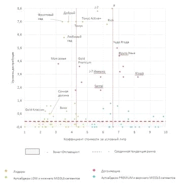 Среди двадцати активно продвигаемых брендов говорить о точности позиционирования можно только в отношении т/м «Фруктовый сад», «J-7» и «Любимый сад» (в категории лидеров) и «Моя семья», «J-7 Иммуно», «Santal» и «Агуша» (в категории догоняющих).