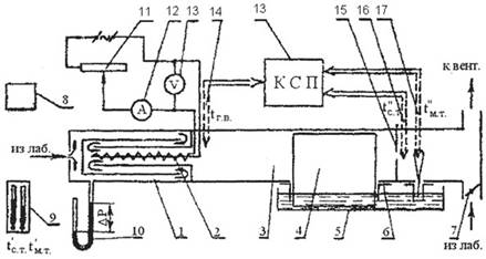 на выходе из калорифера измеряется с помощью термопары 11. Температура