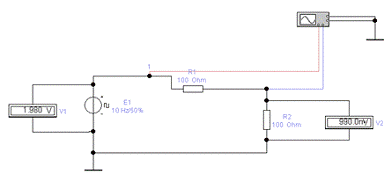Вольтметры V1 и V2 переведены в режим измерения постоянного тока (режим DC)для измерения постоянной составляющей входного и выходного сигналов.