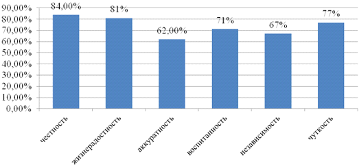 Данные значения раскрывают не только особенности развития личности юношей и девушек 18-23 лет, но и особенности формирования и становления личностных качеств, необходимых для установления взаимоотношений в социуме (честность, жизнерадостность, воспитанность), укрепления эмоциональных связей со значимыми людьми (чуткость), самореализации в целом. К примеру, параметр «независимость» необходим для успешного самоопределения человека, развития способности действовать самостоятельно и решительно.