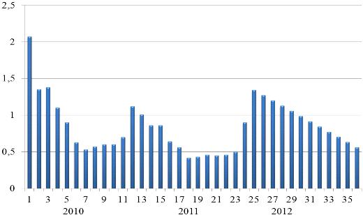 Построение и расчет адекватной математической модели для изучения нагрузки незанятых граждан на одну вакансию на следующие годы позволяет придти к выводу, что уровень безработицы в 2012 снизится на 54% по сравнению с 2010 годом. Таким образом, используя возможности Microsoft Excel, осуществлено прогнозирование на основе ряда анализируемых показателей за два года. При этом получены следующие данные:
