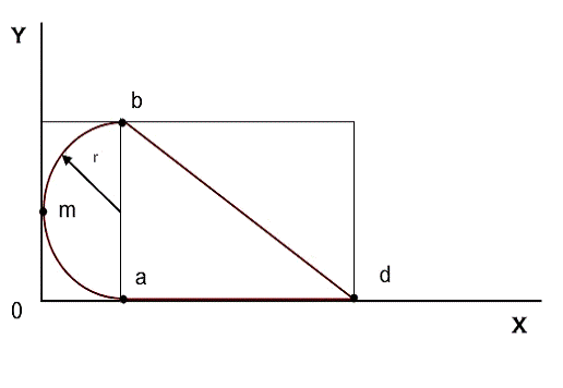 Искомую фигуру можно разбить на две более простые: полуокружность ab и треугольник abd. Следовательно, надо проверять попала ли точка в треугольник или полуокружность в зависимости от значения координаты x случайно сгенерируемой точки, т.е если координата x точки меньше, чем координата х центра полуокружности, то проверяем попала ли точка в полуокружность, иначе проверяем попала ли точка в треугольник.