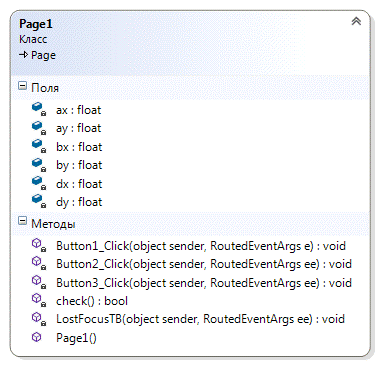 Button1_Click(object sender, RoutedEventArgs e):void - обработчик события нажатия на кнопку Button1, вызывает метод check класса Page1, вызывает методы расчёта площади фигуры, осуществляет вывод результатов;