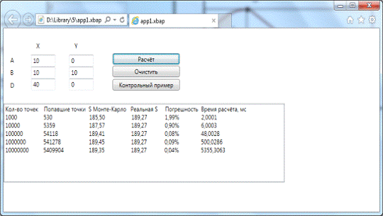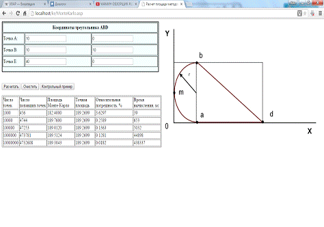Страница MonteKarlo.asp, реализует вычисление площади геометрической фигуры, относительной погрешности вычислений и времени. Данная страница написана на языке скриптов Jscript.