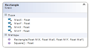 Rectangle(float MiX, float MaX, float MiY, float MaY)- инициализирует прямоугольник по четырем точкам;