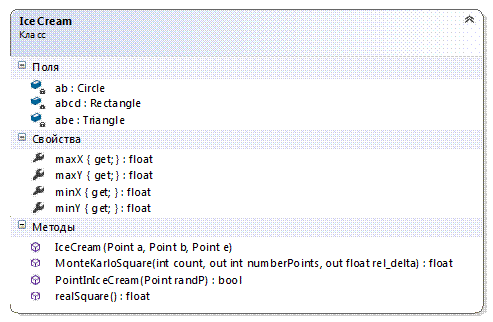 _Square(float ax, float ay, float bx, float by, float ex, float ey, int count, out int numberPoints, out float real_delta, out float realsquare, out DateTime start, out DateTime end):float - вызывает метод MonteKarloSquare(count, out numberPoints, out real_delta) класса IceCream;