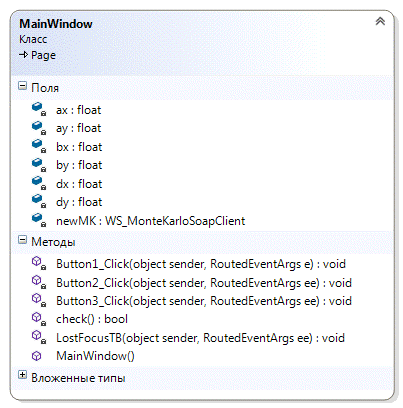 _Click(object sender, RoutedEventArgs e):void - обработчик события нажатия на кнопку Button1, вызывает метод MK_Square веб-сервиса WebSevice_MonteKarlo, выводит результаты выполнения веб-метода в таблицу;_Click(object sender, RoutedEventArgs e):void - обработчик события нажатия на кнопку Button2, очищает поля для ввода координат;3_Click(object sender, RoutedEventArgs e):void - обработчик события нажатия на кнопку Button3, инициализирует точки, необходимые для контрольного примера, заполняет поля для ввода координат;