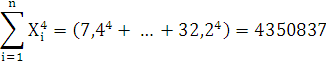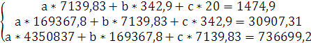 Найдем коэффициенты a, b и c для уравнения параболической регрессии по формулам (7):
