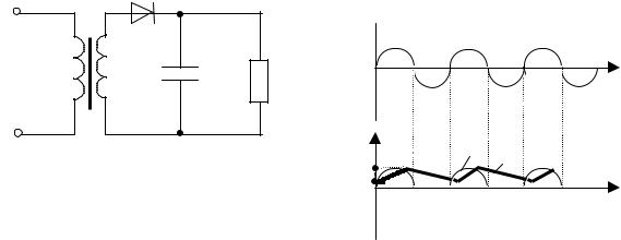 Выпрямленное напряжение вторичной обмотки представляет собой последовательность импульсов (полуволн) положительной полярности (кривая 1 рис.2.17). Действие конденсатора С заключается в том, что он в положительные полупериоды напряжения вторичной обмотки запасает энергию и отдает ее в нагрузку в промежутках между импульсами (кривая 2, рис.2.17). В результате пульсации напряжения на нагрузке зна-