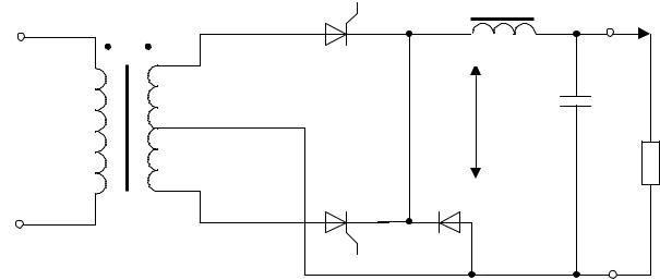 В представленном на рис.2.19 выпрямителе реализуется функция стабилизации выходного напряжения. Схема управления вырабатывает сигналы управления тиристорным коммутатором в зависимости от значения выходного напряжения и фазового угла переменного напряжения на входе