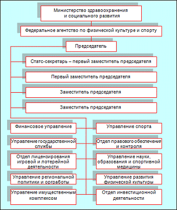 В связи с избранием В.В. Путина в 2004 г. на новый президентский срок, а также в целях оптимизации государственных функций, Правительство РФ было реформировано. В соответствии с концепцией правительственной реформы Госкомспорт переходил под эгиду вновь созданного Министерства здравоохранения и социального развития и получал статус Федерального агентства по физической культуре, спорту и туризму (к началу 2005 г. управление туристической отраслью стало осуществлять Федеральное агентство по туризму). При этом лимитировалась штатная численность сотрудников агентства (152 чел.) и пересматривалась структура управления (см. рис. 4).