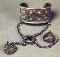 В украшениях «геометрического стиля» выявляются яркие аналогии с ювелирными изделиями гунской эпохи. Общими признаками являются декорировка украшений по центру вставками из сердолика, по краям - витой сканью, а в остальной свободной части - треугольниками из зерни. Казахские украшения данной группы являются, по-видимому, результатом эволюционного развития, усовершенствования технических приемов и декоративных решений ювелирного искусства гунского периода. Ряд существенных параллелей в технологии и декоративном решении прослеживается также с украшениями туркмен, каракалпаков, народов Дагестана.