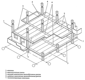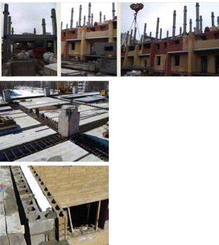 Соединение элементов каркаса между собой обеспечивается путем устройства монолитных несущих и связевых ригелей с одновременным затеканием бетона в шпонки, образованные из пустот по торцам плит перекрытий (в нашем случае это плиты ППС) и в проемы колонн. Ригели в одной блок-секции могут быть ориентированы в продольном и поперечном направлении. Арматурные стержни из каркаса монолитных ригелей, пропущенные в проем колонны через проемы, после замоноличевания повышают жесткость здания. Такое армирование способно выдерживать знакопеременные нагрузки, характерные для сейсмических воздействий. Наружные стены, опирающиеся на каждом этаже, самонесущие, выполняются из вибропрессованных блоков и облицовочного цветного кирпича. В перспективе произойдет замена вибропрессованных блоков на пенобетонные блоки, улучшенных характеристик. Это уменьшит нагрузку на фундамент и приведет к снижению себестоимости строительства.