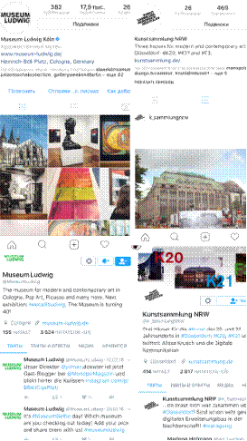 Оба музея имеют учетные записи в данных социальных сетях. В обоих случаях число подписчиков больше у музея Людвига. Стоит отметить, что музей Людвига перестал вести Твиттер с 2016 года. Его инстаграм страница существует с апреля 2014 года и за два года набрала 17,9 тысяч подписчиков. Для музея это не просто способ выставить информацию о выставке, это стал канал связи с посетителями, где публикуется не только информация о работе музея, проводятся опросы, но и благодаря новым функциям инстаграма сотрудники музея постоянно записывают и проводят онлайн трансляции из музея. Так например, последняя трансляция, на момент написания данной работы, была посвящена монтированию выставки Отто Фройндлиха.