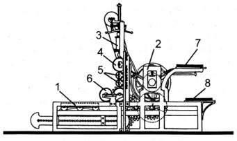 Рис. 2. Схема первой плоскопечатной машины: 1 - подвижной талер с печатной формой; 2 - печатный цилиндр; 3 - красочный ящик; 4 - дуктор; 5 - раскатные валики; 6 - накатные валики; 7 - стопа бумаги на накладном столе; 8 - оттиски на приемном столе