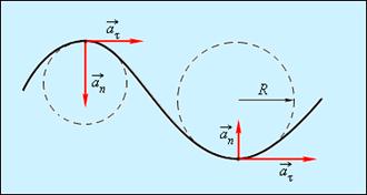Направление вектора ускорения в случае криволинейного движения не совпадает с направлением вектора скорости. Составляющие вектора ускорения называют: касательным (тангенциальным) и нормальным ускорениями.