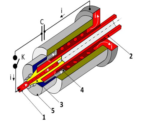 магнитоплазменного ускорителя: 1. Центральный электрод; 2. Электрод-ствол; 3.