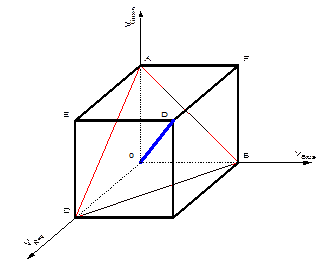 Вершины куба A, B, C являются максимальными интенсивностями зеленого, синего и красного соответственно, а треугольник, которые они образуют, называется треугольником Паскаля. Периметр этого треугольника соответствует максимально насыщенным цветам. Цвет максимальной насыщенности содержит всегда только две компоненты. На отрезке OD находятся оттенки серого, причем тока O соответствует черному, а точка D белому цвету.