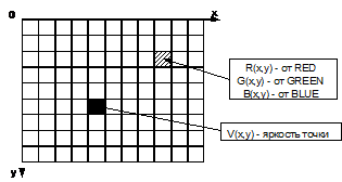 Цифровое изображение - это совокупность пикселей. Каждый пиксел растрового изображения характеризуется координатами x и y и яркостью V(x,y) (для черно-белых изображений). Поскольку пикселы имеют дискретный характер, то их координаты - это дискретные величины, обычно целые или рациональные числа. В случае цветного изображения, каждый пиксел характеризуется координатами x и y, и тремя яркостями: яркостью красного, яркостью синего и яркостью зеленого цветов (VR, VB, VG). Комбинируя данные три цвета можно получить большое количество различных оттенков.