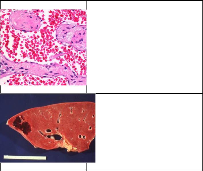 В тканинах печінки інкапсульований, неправильної форми з чіткими межами вузол темно-червоного кольору за рахунок великої кількості крові, на розрізі – губчастого виду. Поряд ще декілька дрібних вузлів губчастого виду.